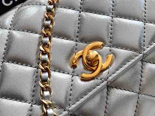 تعكس حقيبة شانيل 5516 كوكو هاندل 23 سم بلون الفضي البلاتيني من مجموعة 25A فخامة عصرية وأناقة خالدة. صُنعت من جلد العجل الفاخر بلمسة معدنية لامعة، وتتميز بمقبض علوي معدني مفرغ مرصع بالكريستال. يعزز التصميم المبطن الكلاسيكي من شانيل مع قفل CC الذهبي حضوراً راقياً ومميزاً.