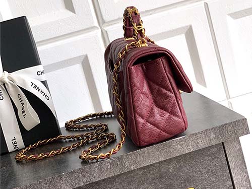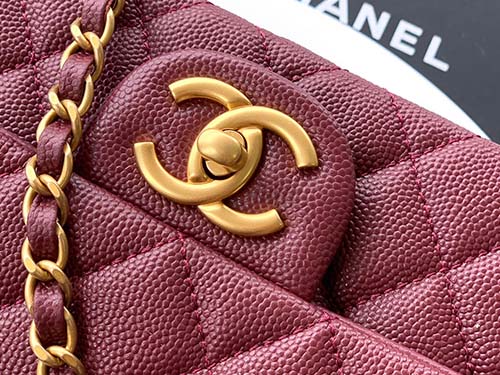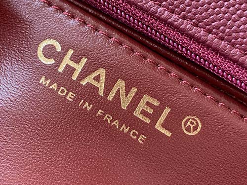 حقيبة Chanel ميني CF ذات المقبض العلوي المصنوعة من جلد الكافيار باللون الخمري ضمن مجموعة Chanel 25B تجمع بين الأناقة الكلاسيكية والعملية الحديثة. تتميز بنقشة شانيل المبطنة الشهيرة، وقفل CC الدوار، ومقبض علوي مزين بسلسلة متشابكة مع الجلد. حجمها الصغير عملي لحمل الاحتياجات اليومية مع الحفاظ على مظهر فاخر وأنيق.