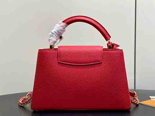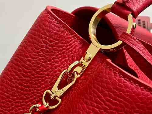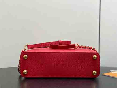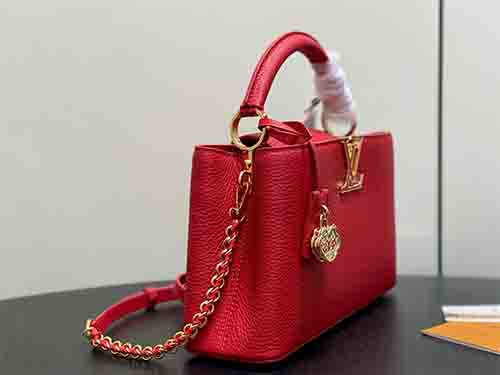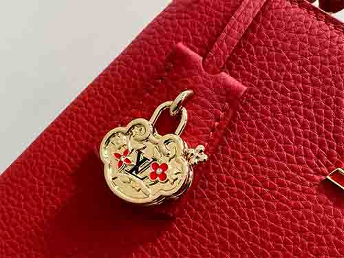 The Capucines BB East-West Mini Bag appears in a vibrant seasonal red to celebrate the Lunar New Year. Crafted from Taurillon leather with smooth leather trim and refined LV lettering, the compact silhouette balances elegance with festive energy. A removable woven shoulder strap allows comfortable crossbody wear, while playful decorative details add a lively touch inspired by the spirit of renewal and celebration. Ideal for day-to-evening transitions with a symbolic seasonal accent.