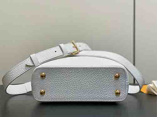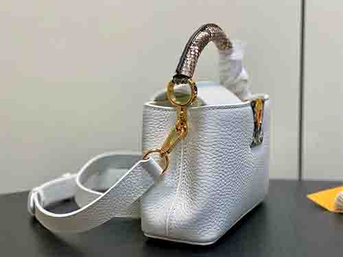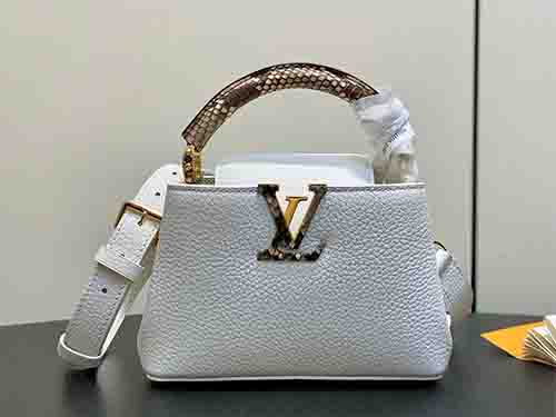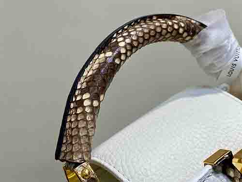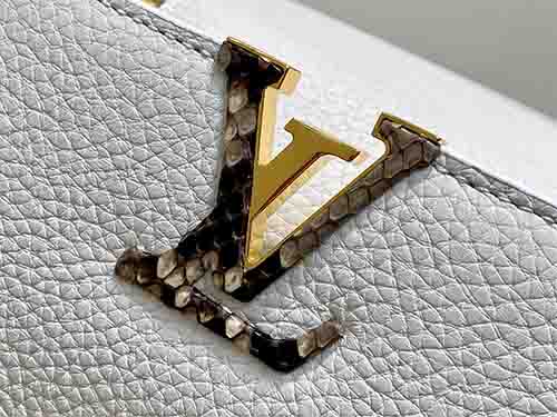Crafted from supple Taurillon leather, the Capucines Mini handbag elevates a House icon with exotic refinement. Luxurious python leather wraps the top handle and LV signature, infusing the timeless silhouette with an alluring, worldly character. Designed for versatility, the detachable shoulder strap allows elegant shoulder carry or hands-free crossbody wear, making it a refined companion from day to evening.