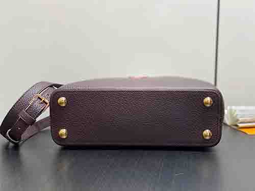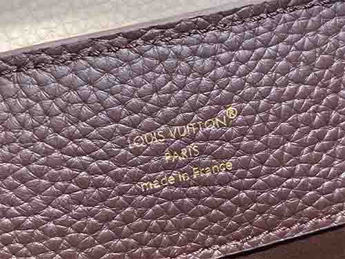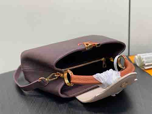 The Capucines Small Handbag in elegant brown colorblock Taurillon leather showcases refined craftsmanship and timeless structure. Accented with polished metal hardware and the iconic LV initials, this structured silhouette embodies modern sophistication. The versatile flap can be worn inside or outside, revealing a neatly organized interior with a secure zipped pocket for valuables. Designed for everyday elegance, it features a removable and adjustable strap for hand carry, shoulder,
