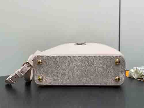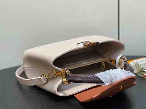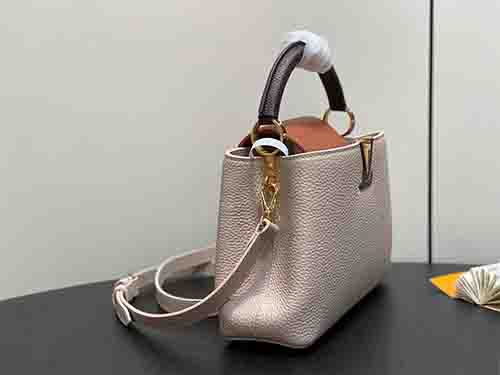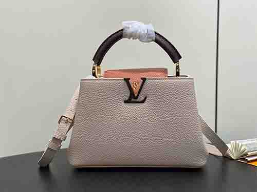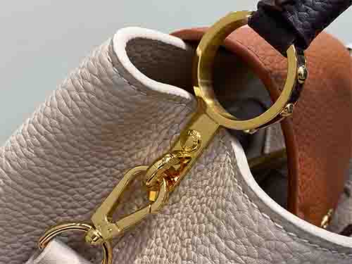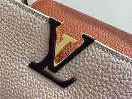 The Capucines Small Handbag M12956 is crafted from luxurious full-grain Taurillon leather in an elegant grey colorblock combination. Accented with polished gold-tone hardware and iconic LV initials, this structured silhouette reflects timeless sophistication. The versatile flap can be styled inside or outside, revealing a neatly organized interior with a secure zipped pocket for valuables. Designed for refined daily wear, it includes a removable and adjustable strap for hand carry, shoulder,