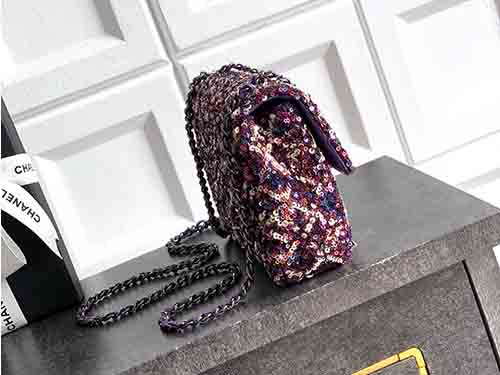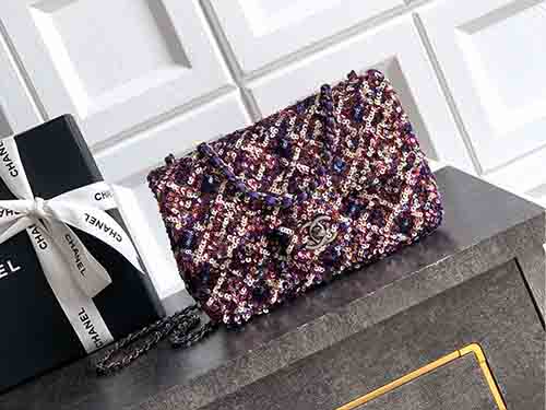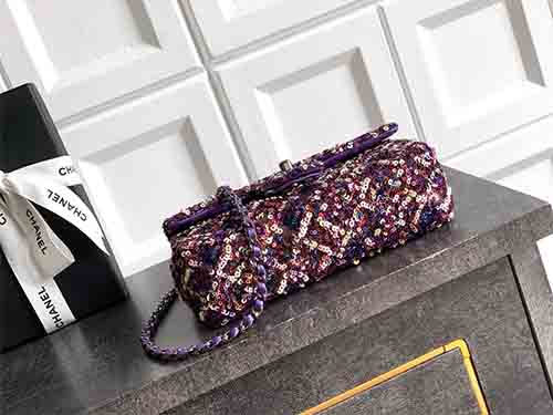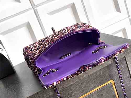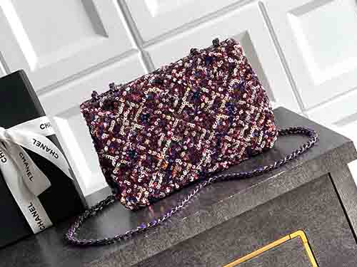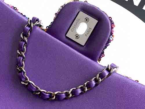 The Chanel 20cm Purple-Pink Sequin CF Flap Bag radiates bold femininity and luminous elegance. Covered in dense shimmering sequins, this Chanel icon sparkles from every angle, blending playful color with refined glamour. The classic CF silhouette preserves Chanel’s timeless structure, while the purple-pink tones add a modern, fashion-forward statement. Perfect for evening occasions or standout styling, this Chanel piece is designed to be treasured for years.