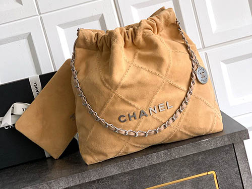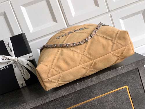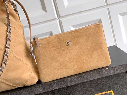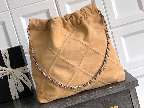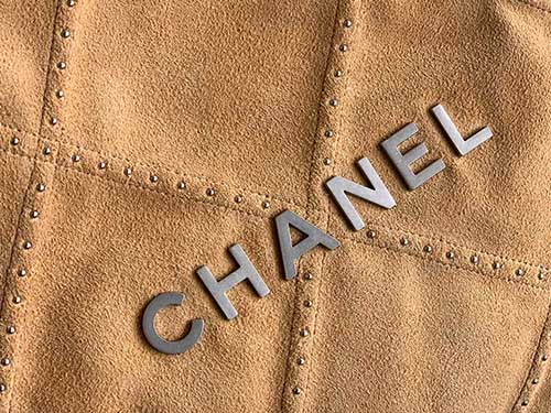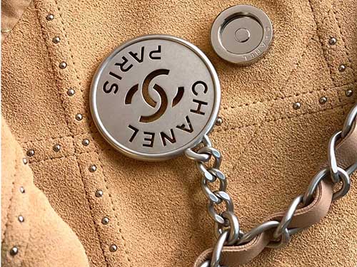 The Chanel 22 Caramel Brown Suede Studded Bag from the 25S collection delivers a bold yet elegant interpretation of Chanel’s modern iconic silhouette. Crafted from soft suede leather, this Chanel bag features silver stud embellishments arranged across the signature quilted pattern, creating a distinctive balance between edgy attitude and timeless sophistication. The drawstring closure forms the recognizable relaxed shape of the Chanel 22 bag, offering both comfort and effortless style. A leather