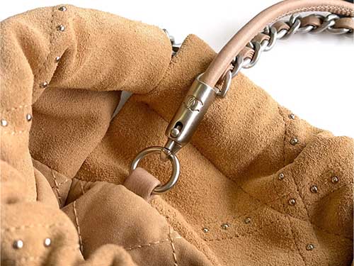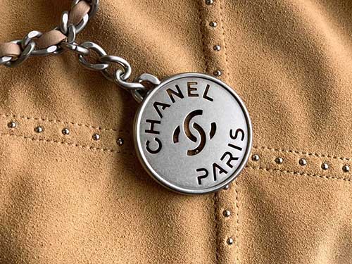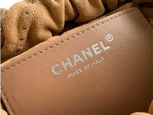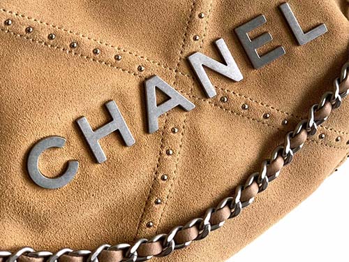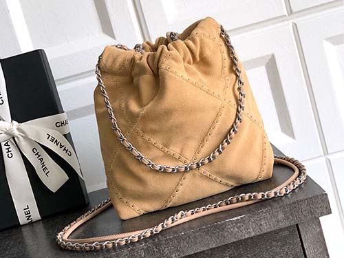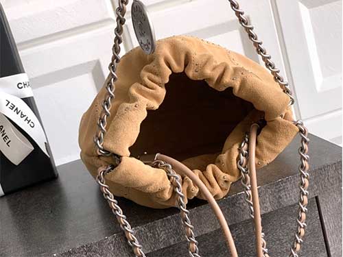 The Chanel 22 Mini Suede Studded Bag from the Chanel 25S collection combines contemporary attitude with timeless Chanel elegance. Crafted from luxurious caramel brown suede leather, the bag features delicate silver stud embellishments across the classic diamond quilting pattern, creating a refined yet edgy aesthetic. The relaxed drawstring silhouette reflects the signature Chanel 22 design, offering a soft and modern structure that is both stylish and practical. A leather-woven chain strap with