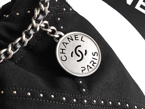 The Chanel 22 Mini Suede Studded Bag from the Chanel 25S collection blends modern attitude with the timeless elegance of Chanel design. Crafted from premium jet black suede leather, the bag features delicate silver stud embellishments across the iconic diamond quilted pattern, creating a bold yet refined aesthetic. The relaxed drawstring silhouette reflects the signature Chanel 22 design, offering a soft structure and effortless style. A leather-woven chain strap paired with vintage silver-tone