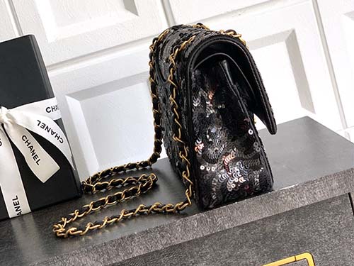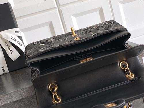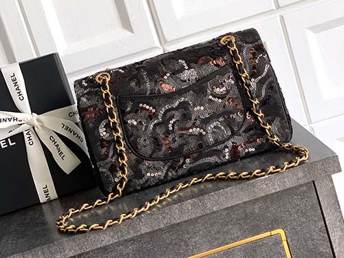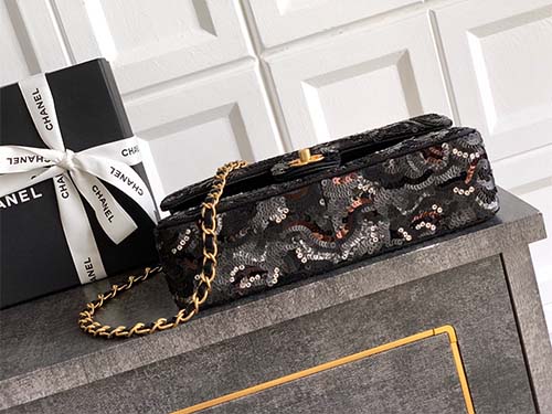 The Chanel 25cm Hand-Painted Sequin Double Flap CF Bag showcases extraordinary couture craftsmanship. Featuring intricate hand-painted detailing combined with dense sequin embroidery and floral embellishments, this Chanel masterpiece radiates brilliance from every angle. The iconic double flap CF structure preserves Chanel’s timeless heritage while elevating it into a true collector’s statement. Designed for gala evenings and refined occasions, this Chanel piece blends elegance, artistry,