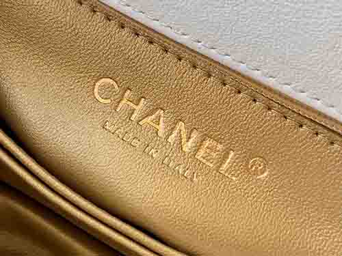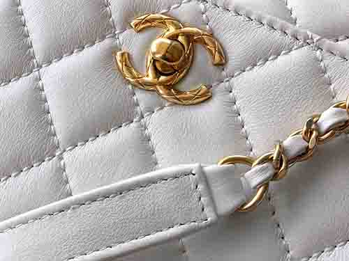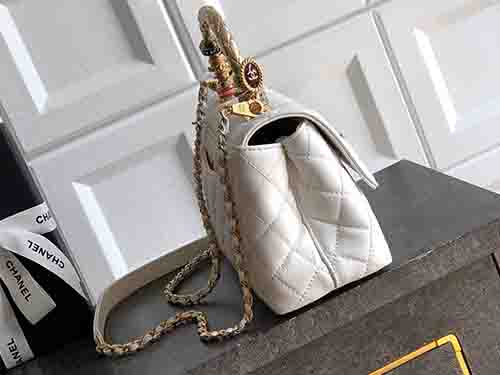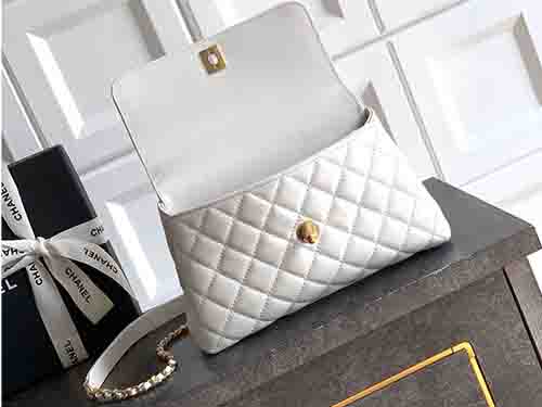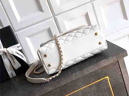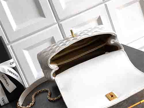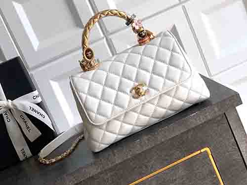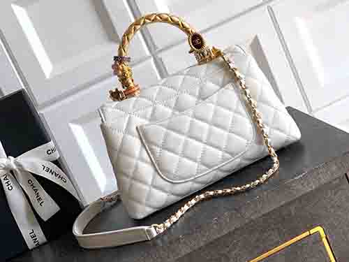 The Chanel 92991 Coco Handle 23cm in milk white radiates refined elegance with brilliant 25K gold detailing. Crafted from premium calfskin leather, this structured Chanel flap bag features a luminous hollow gold-tone ring handle embellished with crystal accents. Blending the iconic Chanel Coco Handle silhouette with jewelry-inspired craftsmanship, it delivers timeless sophistication and statement appeal. The soft milk white tone enhances its graceful character, while polished gold Chanel
