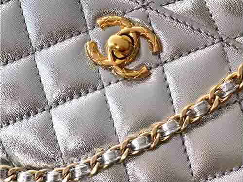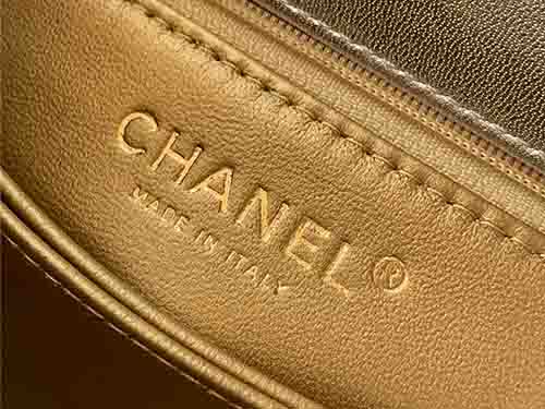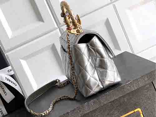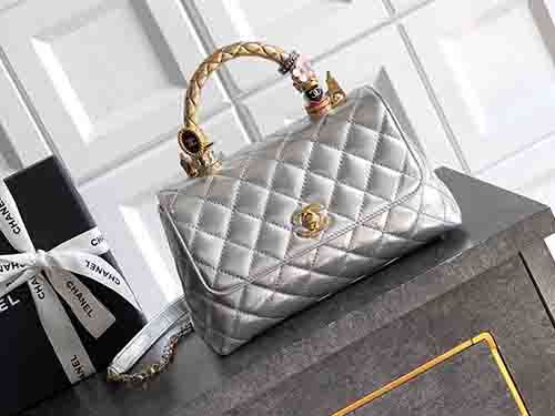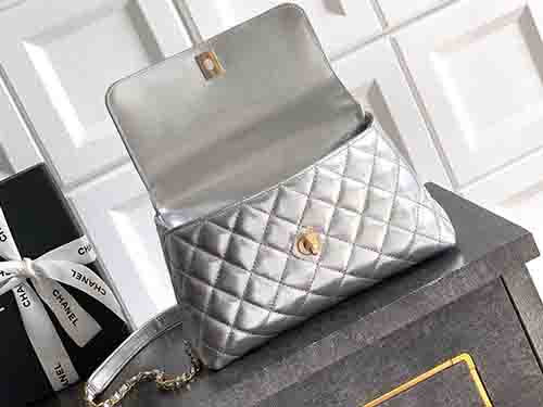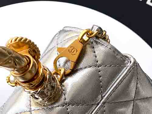 The Chanel 92991 Coco Handle 23cm in luminous silver redefines modern glamour with bold 25K gold brilliance. Crafted from premium calfskin leather, this structured Chanel flap bag features a radiant hollow gold-tone ring handle adorned with crystal detailing. The metallic silver tone enhances its contemporary edge, while the signature Chanel Coco Handle silhouette preserves timeless elegance. Finished with polished gold Chanel hardware, this piece delivers a striking balance between vintage