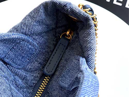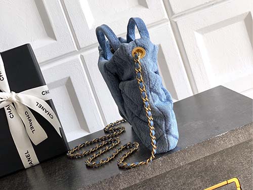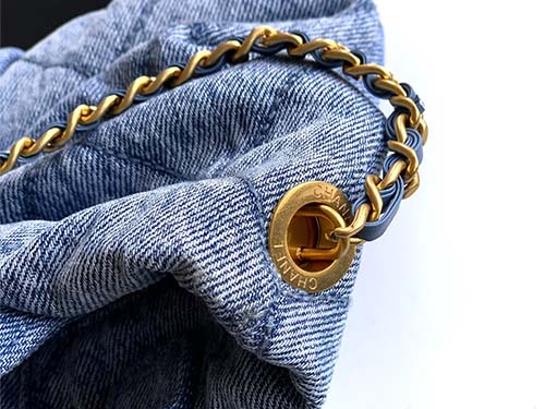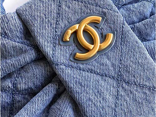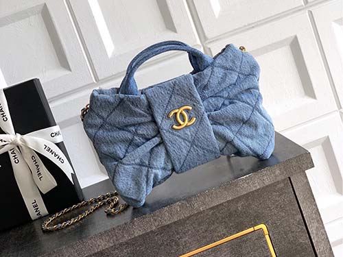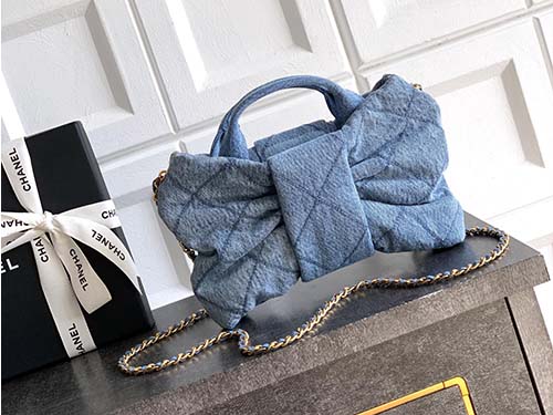 The Chanel Bow Top Handle Bag in Light Washed Denim Blue offers a fresh and youthful interpretation of Chanel’s classic design language. Crafted from soft washed denim with a subtle gradient texture, the bag features a distinctive oversized bow silhouette combined with the iconic diamond quilted pattern. The light blue tone brings a relaxed and effortless aesthetic, while the gold CC logo hardware adds a refined contrast that elevates the overall look. Designed to balance elegance and practicali