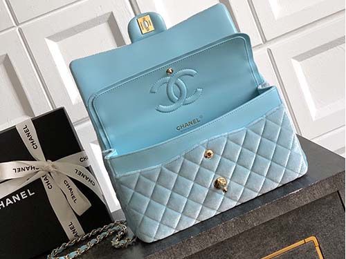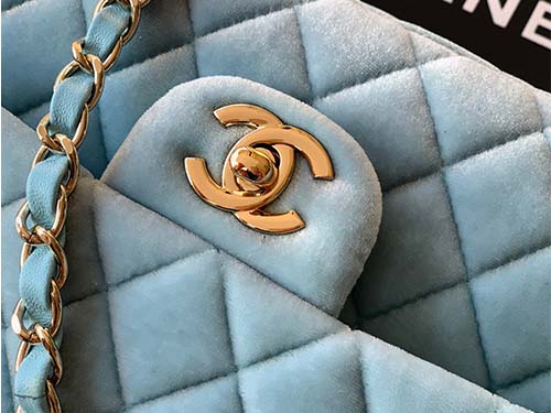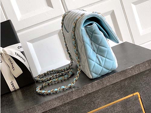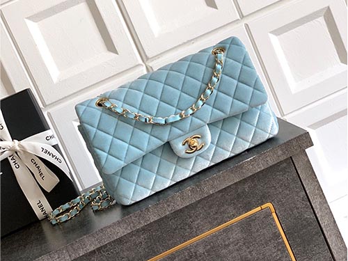 The Chanel Classic Flap Velvet Bag in elegant lake blue combines timeless Chanel heritage with refined vintage charm. Crafted from luxurious velvet with the iconic diamond quilted pattern, this bag features the classic double flap construction and signature CC turn-lock closure. The soft velvet texture enhances the richness of the color while creating a sophisticated retro aesthetic. The leather-woven chain strap allows the bag to be worn comfortably as a shoulder bag or crossbody. Despite its