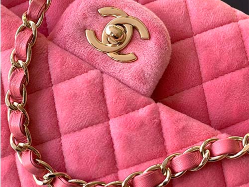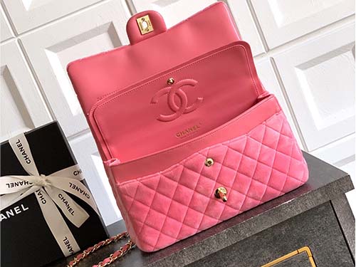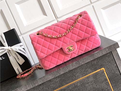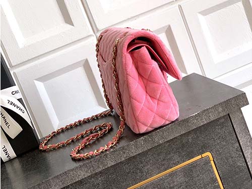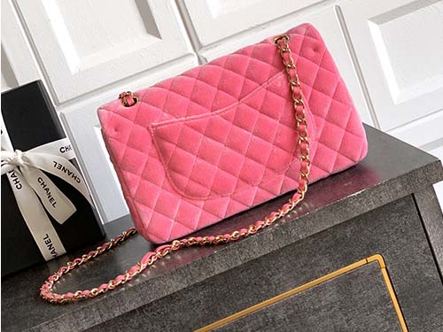 The Chanel Classic Flap Velvet Bag in elegant sakura pink perfectly blends timeless Chanel heritage with a romantic vintage aesthetic. Crafted from luxurious velvet with the iconic diamond quilting pattern, the bag features the classic double flap construction and signature CC turn-lock closure. The soft velvet texture enhances the gentle pink tone while creating a refined retro charm. The leather-woven chain strap allows the bag to be worn comfortably as a shoulder bag or crossbody, making it