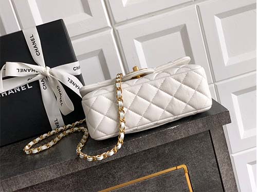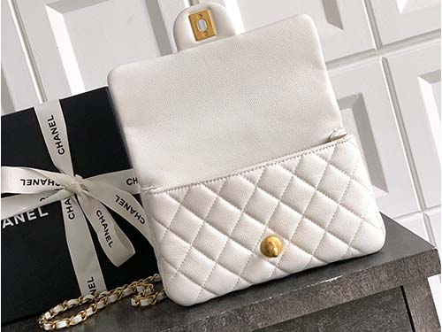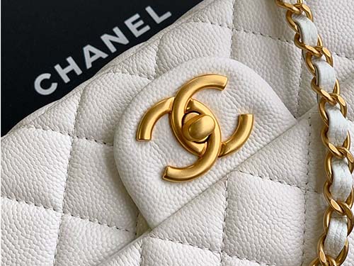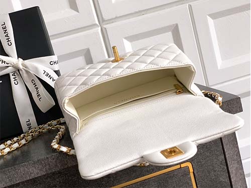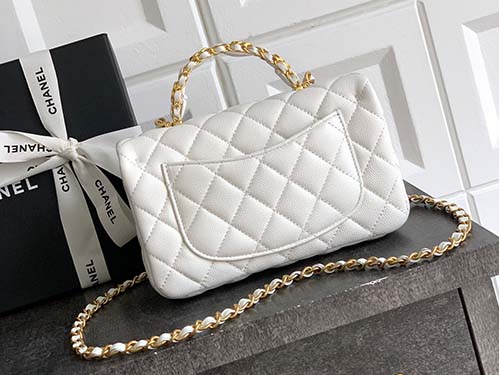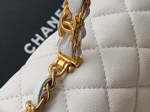 The Chanel 25B CF Handle Bag in elegant cream white offers a sophisticated interpretation of the iconic Chanel flap silhouette. Crafted from textured caviar leather, this Chanel bag blends durability with refined luxury. The structured top handle features the classic leather-woven chain design, finished with a signature double-C charm that highlights the timeless Chanel identity. Its clean cream white tone adds a soft and versatile elegance, making it easy to pair with both casual and formal out