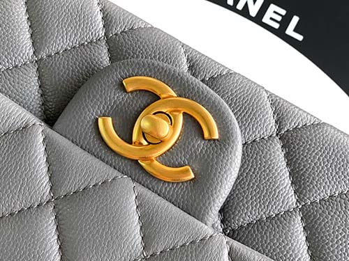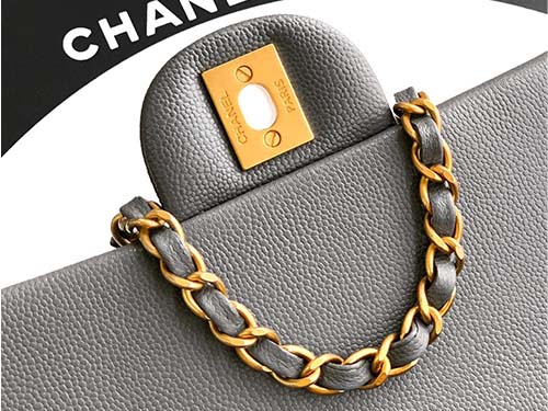 The Chanel 25B CF Handle Bag in iron grey presents a refined interpretation of the iconic Chanel flap silhouette with an elegant top-handle design. Crafted from textured caviar leather, this Chanel bag combines durability with a sophisticated appearance, making it ideal for everyday luxury styling. The handle features the classic leather-woven chain structure, finished with a signature double-C charm that highlights the timeless Chanel identity. The compact small size maintains the elegant