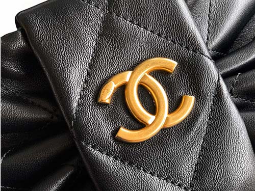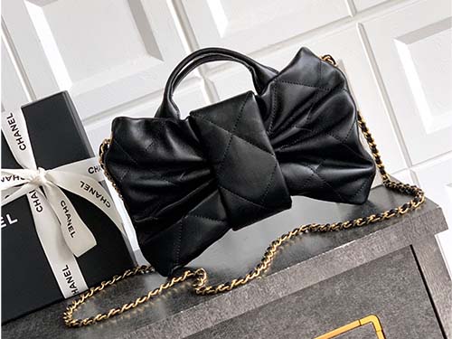 This Chanel-inspired statement bow handbag in black Antiba lambskin represents timeless sophistication and structured luxury. Crafted from premium oil-waxed lambskin, the surface features a subtle natural sheen while offering enhanced durability and scratch resistance compared to traditional lambskin. The quilted oversized bow design creates a bold yet refined silhouette, while the gold-tone hardware adds contrast and elegance. With its structured form and practical interior, this bag easily