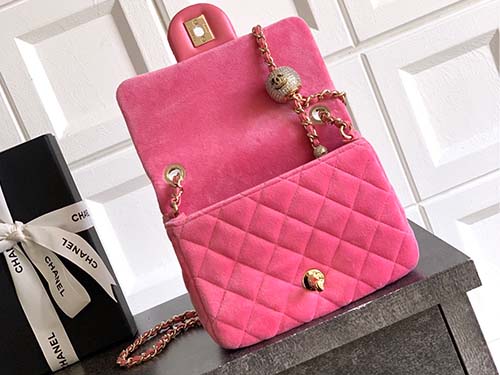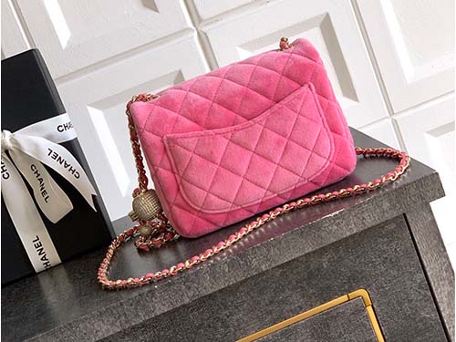 The Chanel Velvet Diamond Ball Mini Flap Bag from the Chanel 25B collection offers a luxurious seasonal reinterpretation of the iconic Chanel Classic Flap design. Crafted from premium velvet in a soft pink tone, this Chanel bag combines timeless elegance with modern glamour. The quilted velvet body highlights the signature Chanel aesthetic, while the iconic CC turn-lock closure preserves the heritage of Chanel craftsmanship. A sparkling crystal diamond ball charm attached to the chain strap