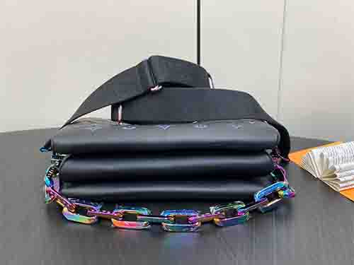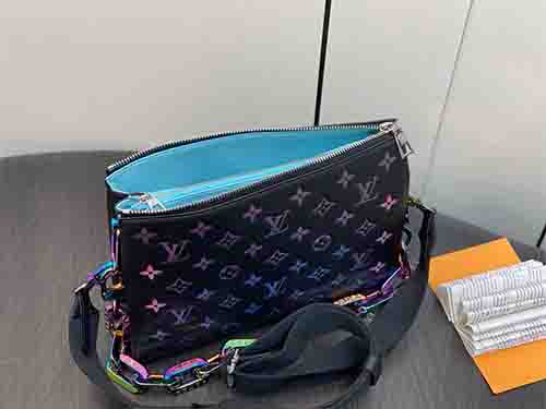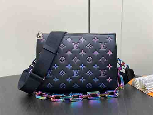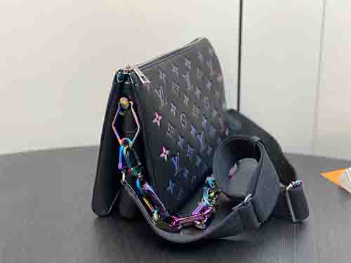 The Coussin Small bag is crafted from softly padded lambskin with a subtle iridescent sheen, showcasing a striking holographic Monogram DCC motif. A detachable rainbow-finish chain adds modern flair, shifting tones beautifully under changing light for a bold yet refined statement.