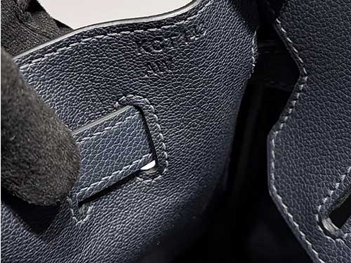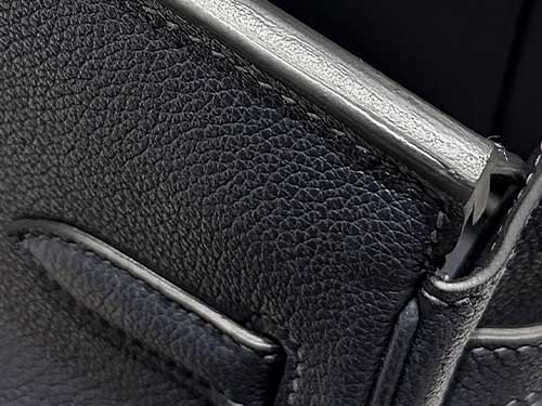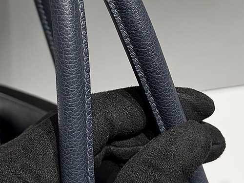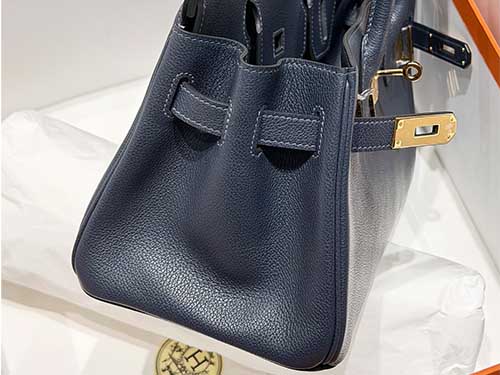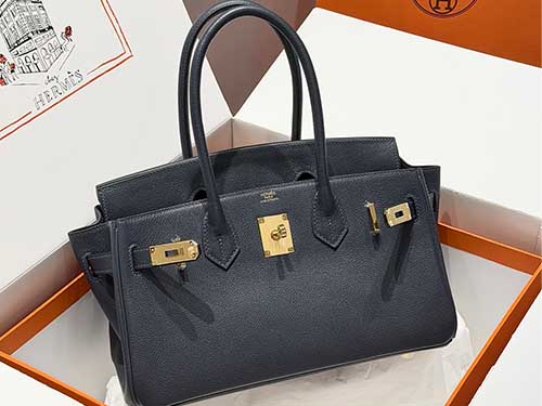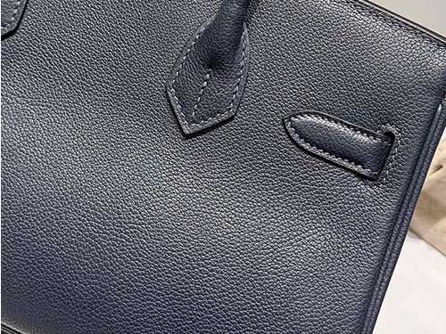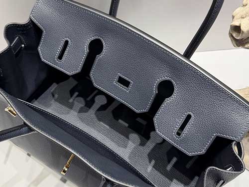 The Hermès Birkin style shoulder bag in Blue Nuit Evercolor leather delivers a refined executive look with a deep navy tone close to black. This color combines the authority of black with a subtle modern twist, making it ideal for professional and formal settings. Crafted from durable Evercolor calfskin, the bag maintains a structured silhouette with excellent resistance to daily wear. The gold hardware enhances its premium presence, adding contrast and a more elevated luxury feel.