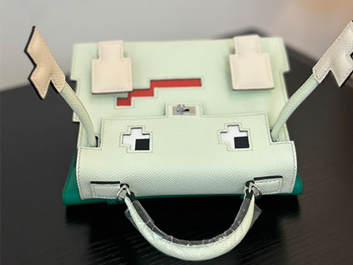 This Mosaic / Pixel Style Kelly Doll features a refreshing mint green base combined with white pixel accents, playful red highlights, and a deeper green side structure. Positioned as a Social Driver, it is designed to enhance visual engagement and attract attention in retail and digital environments. Crafted from imported Epsom leather with hand-finished stitching and silver hardware, it supports both display impact and structured wholesale consistency.