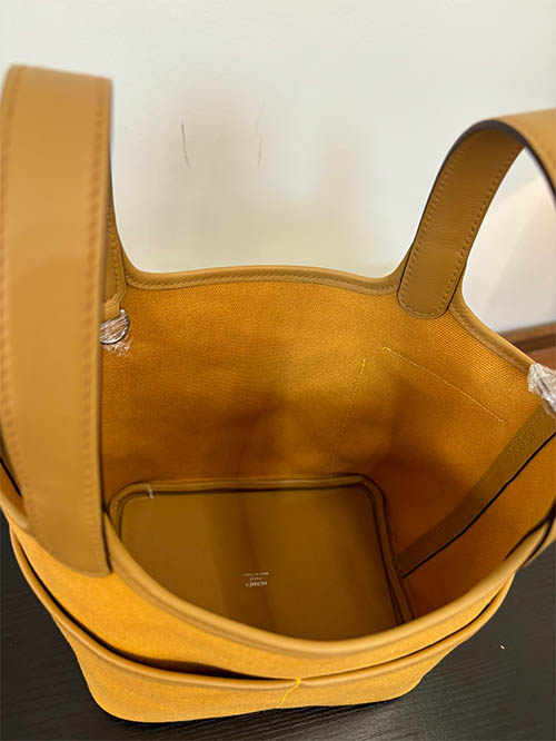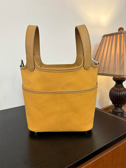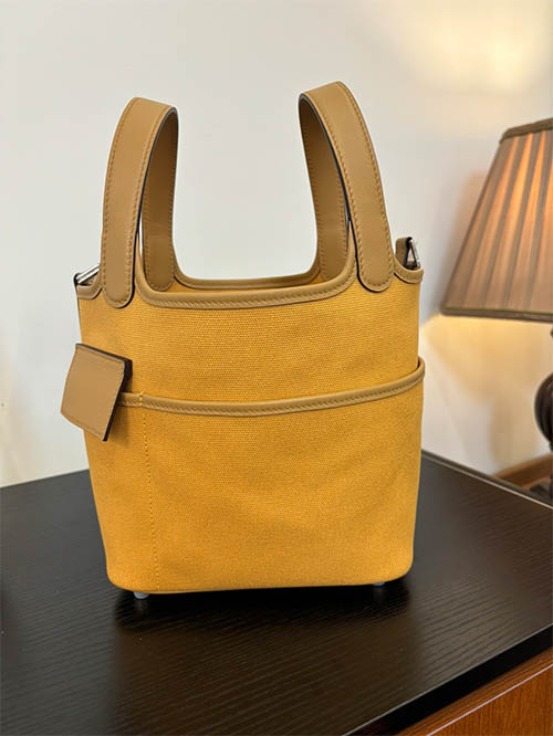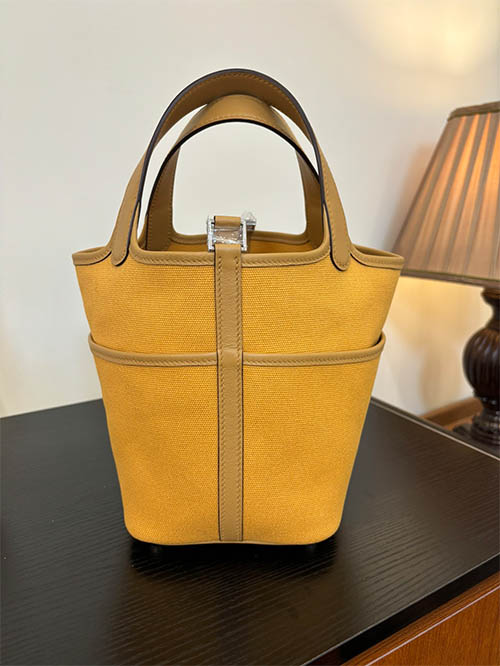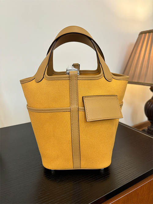 Hermès Picotin Lock Cargo 18 Honey Yellow is positioned as a visual driver within the canvas-leather hybrid series.