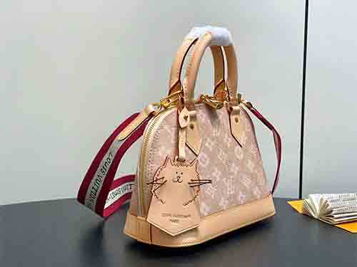 The Alma BB Meowgram bag is part of Louis Vuitton’s celebrated Travels With Grace Coddington collection, created in collaboration with the iconic fashion editor and creative visionary. Featuring the playful Meowgram motif, this design reimagines the House’s classic Alma silhouette with charm, wit, and refined craftsmanship. Crafted from coated Meowgram canvas with smooth cowhide leather trim, the bag is accented by a detachable textile strap adorned with Coddington’s handwritten “Louis Vuitton”