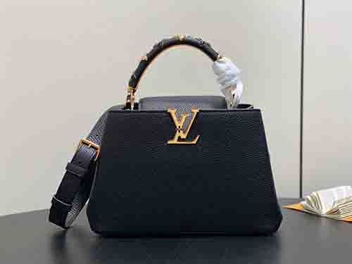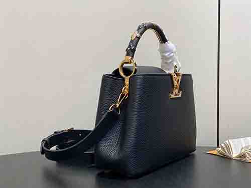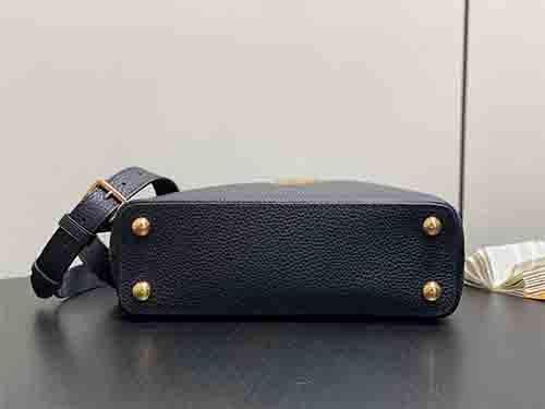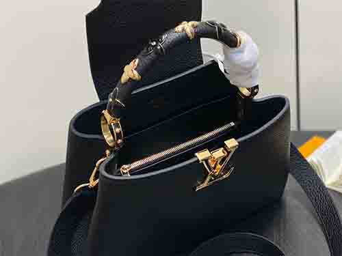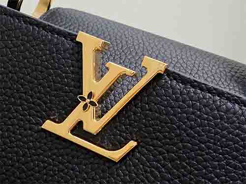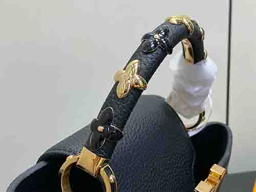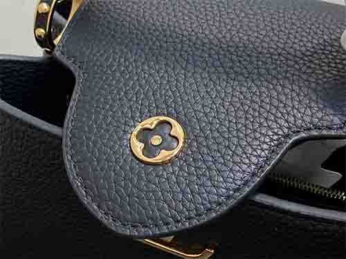 The Louis Vuitton Capucines BB M14976 elevates the Maison’s signature elegance through refined craftsmanship and sculptural detail. Crafted from full-grain Taurillon leather, this black Capucines BB features an exquisitely designed handle adorned with Monogram floral motifs, subtly enhancing the iconic LV signature with dimensional depth. The result is a graceful yet striking expression of modern heritage, balancing timeless structure with delicate decorative artistry.