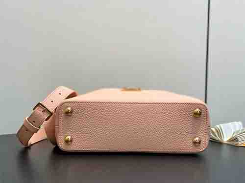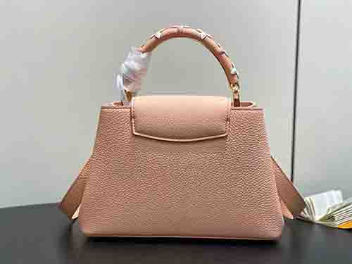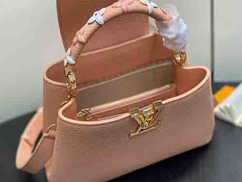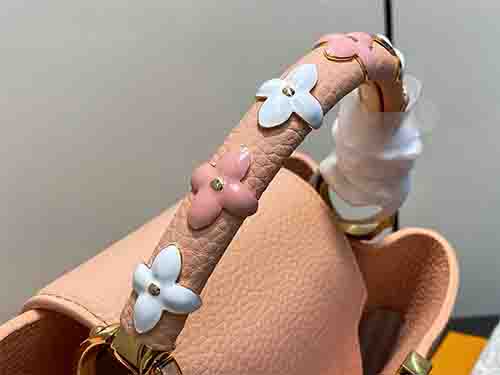 The Louis Vuitton Capucines BB M14976 in nude tone embodies refined elegance through subtle color harmony and exquisite craftsmanship. Crafted from full-grain Taurillon leather, this Capucines BB is enhanced by a delicately sculpted handle adorned with Monogram floral motifs, giving dimensional depth to the iconic LV signature. The soft nude palette accentuates the bag’s graceful structure, offering a luminous interpretation of modern heritage with timeless sophistication.
