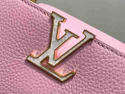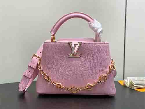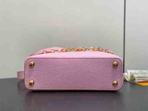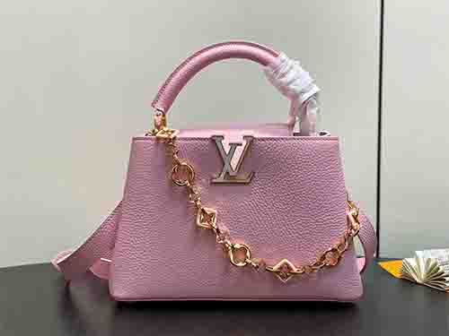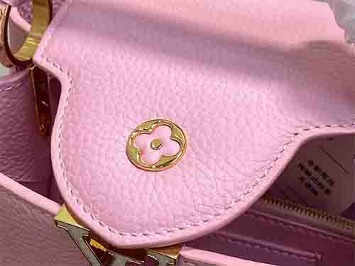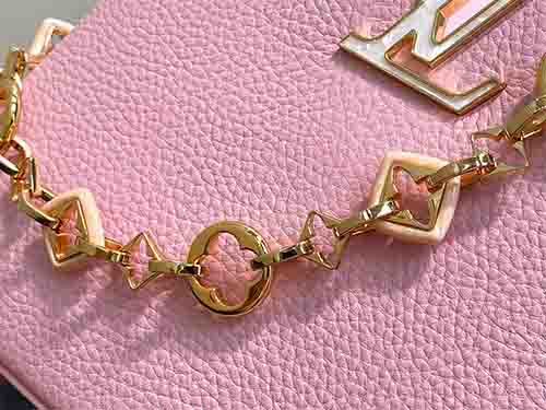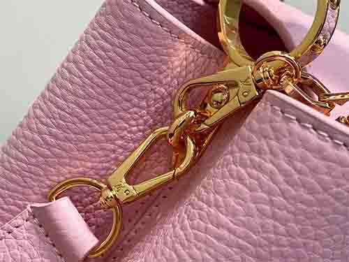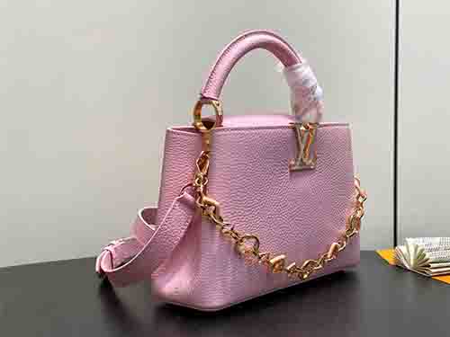 Named after the Parisian street where Louis Vuitton opened his first boutique in 1854, the Capucines BB embodies the Maison’s timeless elegance in a versatile mid-size silhouette. This pink edition joins the Harmony collection, crafted from supple Taurillon leather to preserve its structured form. A decorative chain inspired by Monogram floral motifs introduces a refined jewelry-like accent, enhancing the iconic LV signature. The BB format offers balanced proportions and practical capacity for