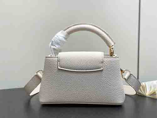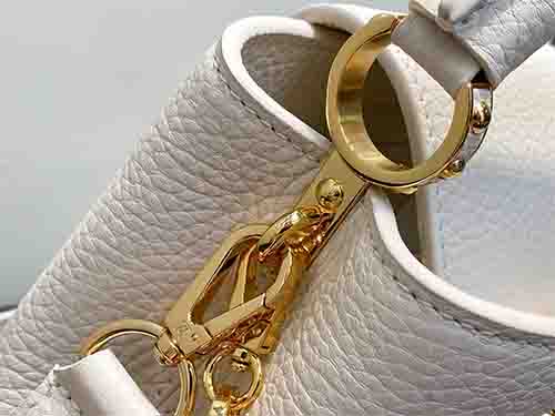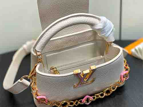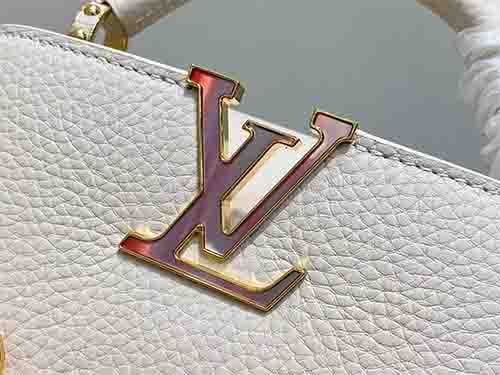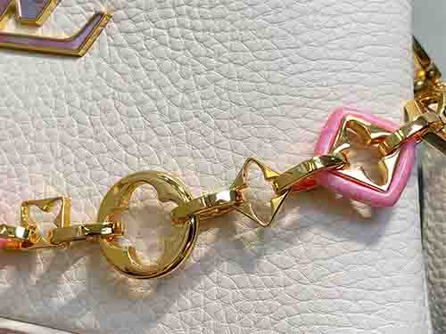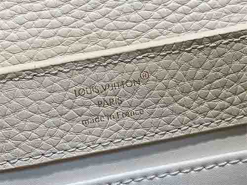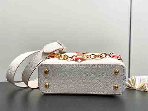 The Louis Vuitton Capucines East-West Mini from the Harmony collection reinterprets the Maison’s iconic silhouette through a refined horizontal proportion. Crafted from supple Taurillon leather in an elegant ivory tone, this edition features a decorative chain inspired by Monogram floral motifs. The LV signature is enhanced with colorful Puffygram detailing, evoking jewelry craftsmanship with a contemporary touch. The structured flap can be worn inside or outside,
