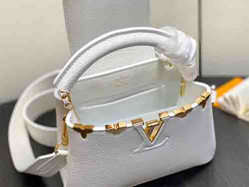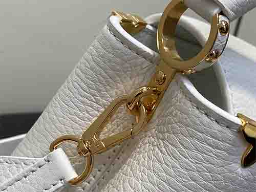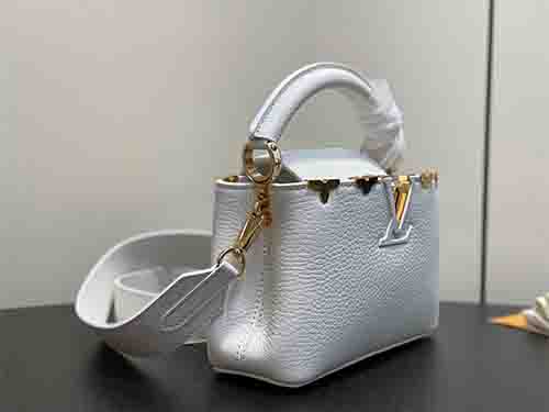 The Louis Vuitton Capucines Mini M56669 expresses delicate craftsmanship through refined detailing and sculptural elegance. Crafted from supple Taurillon leather, this white edition is adorned with a Monogram floral “crown” motif, individually hand-applied to the leather for a jewelry-inspired finish. The charming mini silhouette enhances its feminine appeal, while the structured form preserves the timeless identity of the Capucines line. Both the leather top handle and detachable wide strap off
