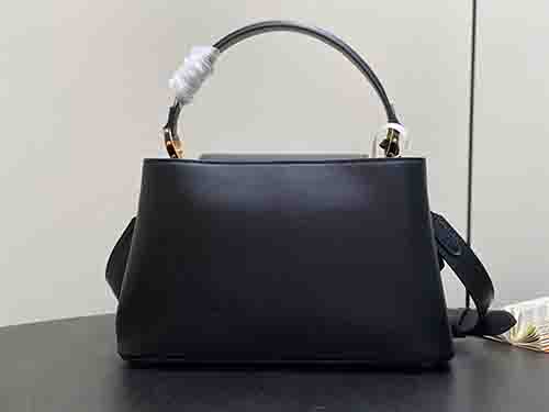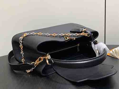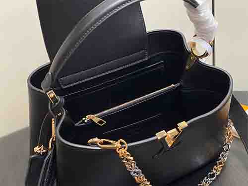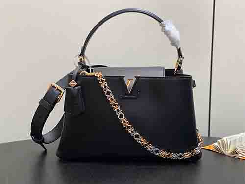 The Capucines Souple Medium reinterprets the Maison’s iconic silhouette with a softer, more fluid structure. Crafted from smooth calf leather, this refined design highlights signature brand elements including a leather key bell and polished padlock. The spacious interior accommodates daily essentials with ease, while the adjustable shoulder strap and decorative chain detail enhance versatility. Elegant yet functional, this Souple edition balances timeless structure with modern practicality.