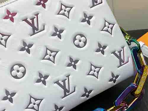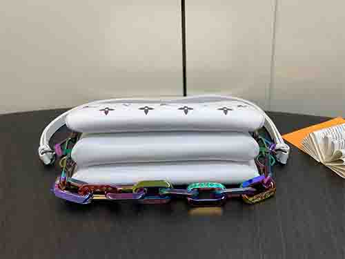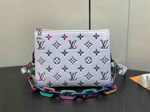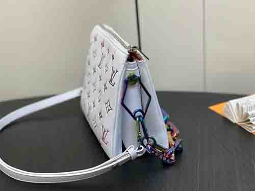 The Coussin BB bag redefines modern luxury with a bold holographic finish crafted from padded lambskin leather. Featuring embossed Monogram Dcc motifs and iridescent accents on selected chain links, the bag reflects vibrant shades under shifting light. Its compact yet practical design includes multiple compartments and a central zipped pocket, making it ideal for both day and evening styling.