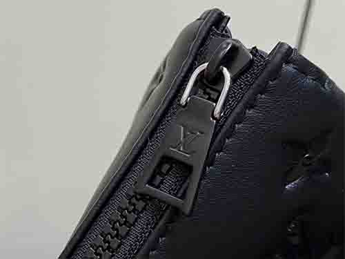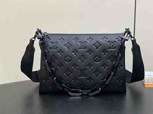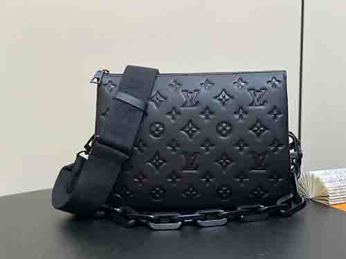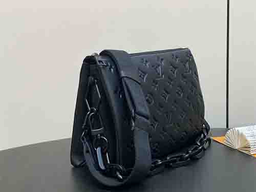 The Coussin Small bag from the Black Out collection brings a bold, modern attitude to a refined silhouette. Crafted from smooth matte leather embossed with the iconic Monogram motif, it features a striking detachable LV chain and sleek metal accents. The spacious interior and secure zip closure make it an ideal companion for daily urban wear, blending functionality with contemporary luxury.