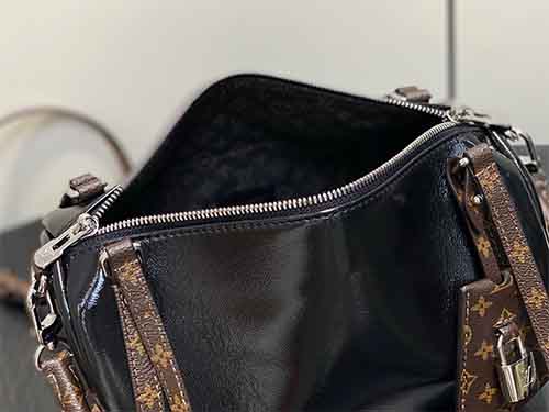 The Express Small handbag reinterprets the iconic Speedy silhouette with a rebellious, rock-inspired attitude. Crafted from glossy black patent calfskin, it showcases the Maison’s Monogram Saga signature for a bold visual statement. Refined leather trims and a Monogram-lined interior elevate the design, while the luminous padlock and key holder—attachable to the zipper pull—add a distinctive finishing touch. Compact yet expressive, this piece is designed for modern styling from day to night.