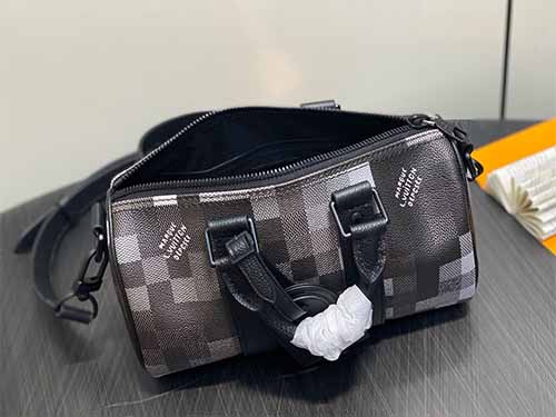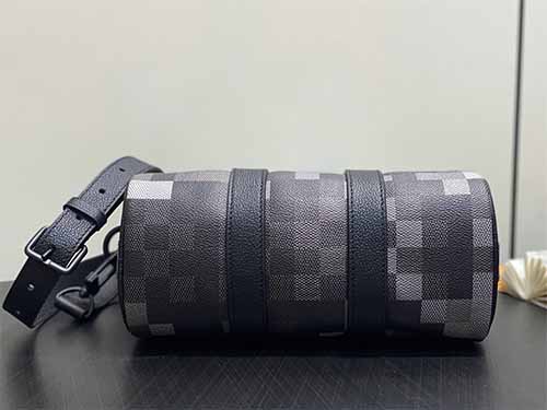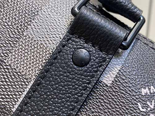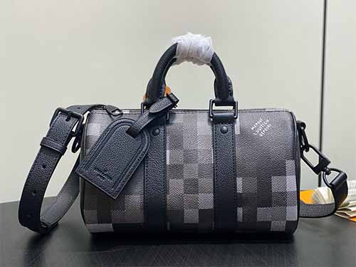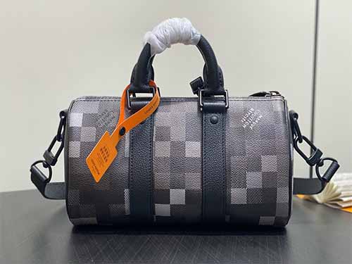 The Keepall Bandoulière 25 is reimagined in Damoflage Black coated canvas, expressing Pharrell Williams’ contemporary vision of the iconic Damier Graphite. Pixelated checks form a deep-toned camouflage effect, blending street culture with luxury heritage. Compact yet practical, this piece features top handles and a removable, adjustable shoulder strap for versatile everyday carry.