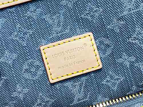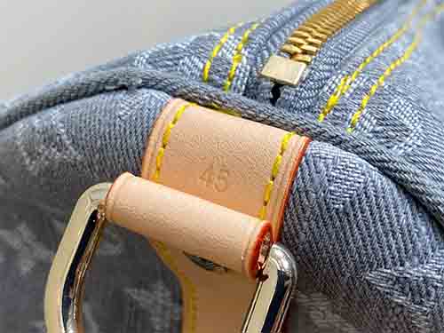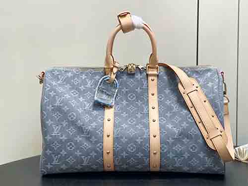 The Keepall Bandoulière 45 travel bag is crafted from soft cotton Monogram denim canvas, paired with smooth leather trim and pale gold-tone hardware. Inspired by the Maison’s iconic trunks, the reinforced side bands add a vintage touch. With rolled leather handles and a removable, adjustable shoulder strap, it offers versatile carrying options for refined travel.