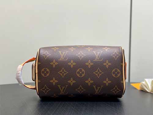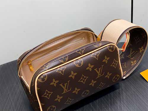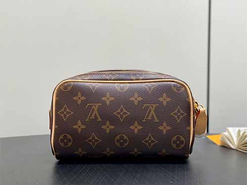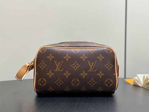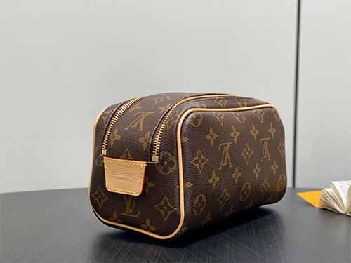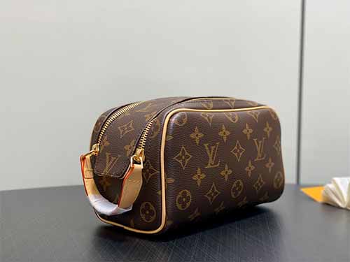 The Louis Vuitton Mini Dopp Kit Toiletry Bag showcases a modern interpretation of the iconic Monogram Heritage coated canvas. Designed with vibrant silk-printed patterns and refined leather details, this compact travel pouch offers both elegance and practicality. The structured silhouette provides enough room for daily grooming essentials while maintaining a sleek, travel-friendly size. A double-zip wide opening ensures convenient access, and the washable textile lining enhances durability for