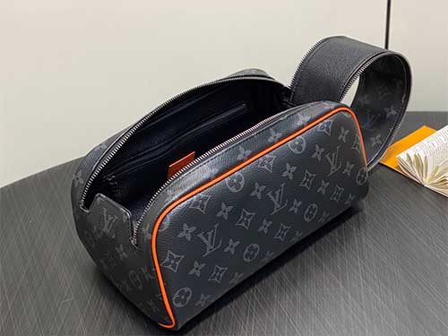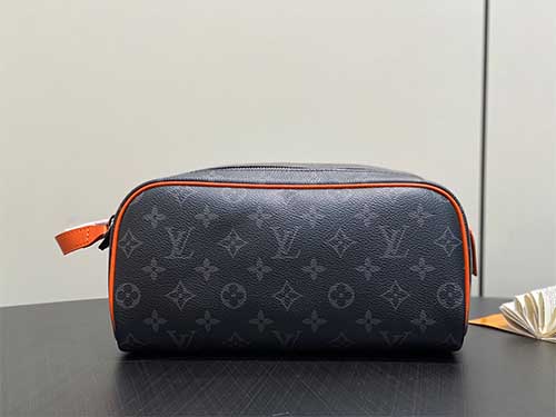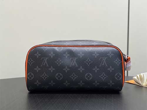 The Louis Vuitton Monogram Macassar Dopp Kit Toiletry Bag combines the House’s iconic Monogram canvas with vibrant modern accents. Crafted from durable Monogram Macassar coated canvas, the design features bright orange leather trim and a leather handle attached to the dual zipper closure, creating a striking contrast against the classic black Monogram pattern. The spacious interior is lined with washable textile fabric for practicality and easy maintenance. Designed to store grooming essentials