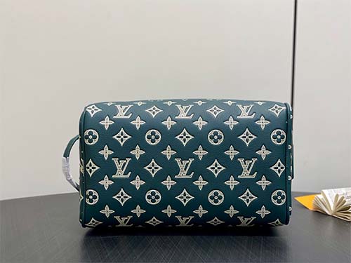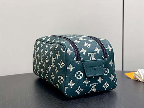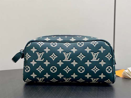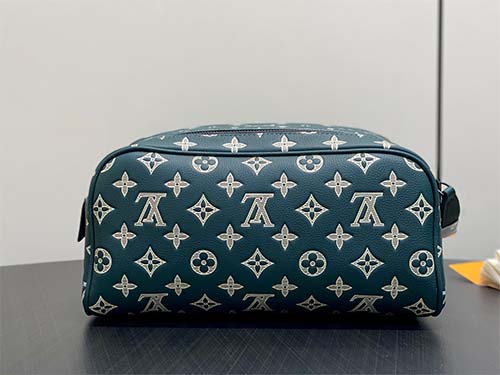 The Louis Vuitton Monogram Shadow Leather Dopp Kit Toiletry Bag offers a refined balance between modern design and everyday practicality. Crafted from premium Monogram Shadow embossed calf leather, the bag features a deep green tone enhanced by a subtle light Monogram print that creates rich visual depth. The structured silhouette delivers a sophisticated and durable look, while the dual zip closure and wide opening provide easy access to grooming essentials. Inside, a washable textile lining