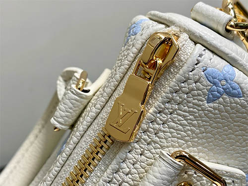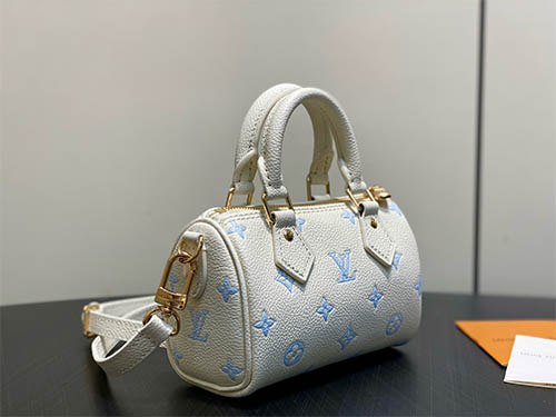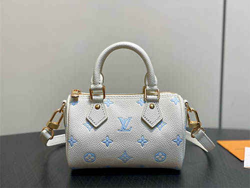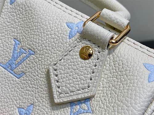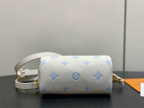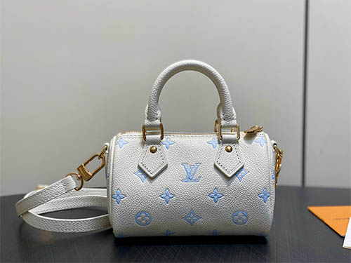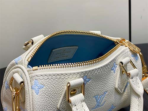 The Nano Speedy bag reinterprets a Maison icon in Monogram Empreinte leather with a refined silk-print finish. Presented in a seasonal blue bicolor palette, this compact design is enhanced by gold-tone hardware and a soft, structured silhouette. Dual top handles and a detachable strap allow versatile styling from day to night.