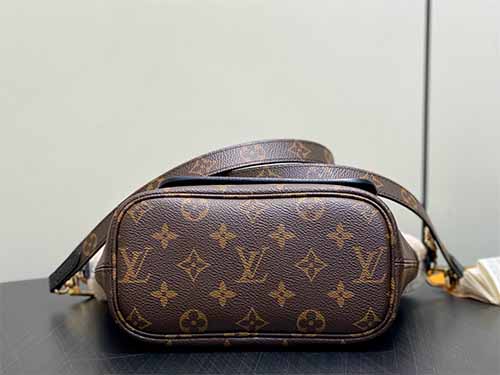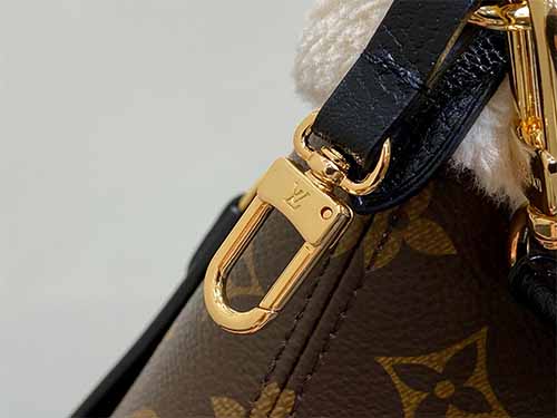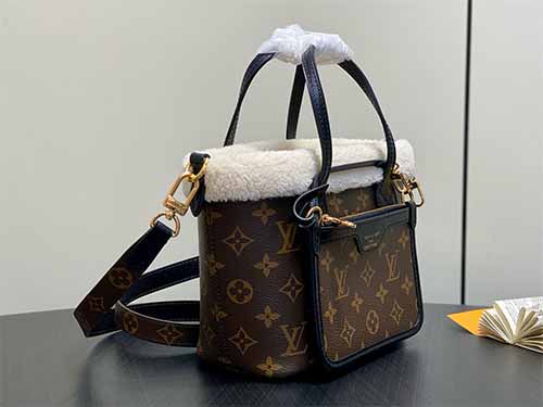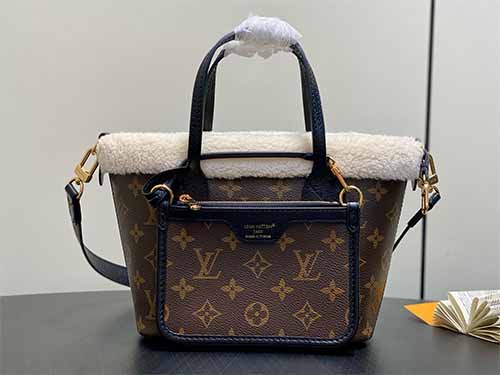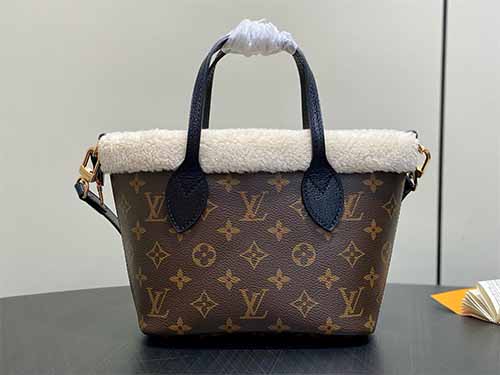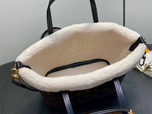 Part of the LV Ski collection, the Neverfull Bandoulière Inside Out BB is reimagined with a cozy yet fashion-forward Teddygram aesthetic. Crafted from iconic Monogram canvas, the bag is trimmed and lined with soft shearling wool, delivering both visual warmth and seasonal appeal. The reversible “Inside Out” construction highlights contrasting textures, while the detachable zipped pouch adds versatility for handheld use. Finished with a long shoulder strap and polished metal hardware,
