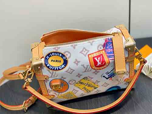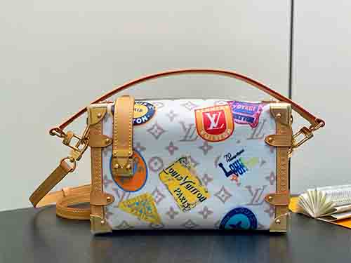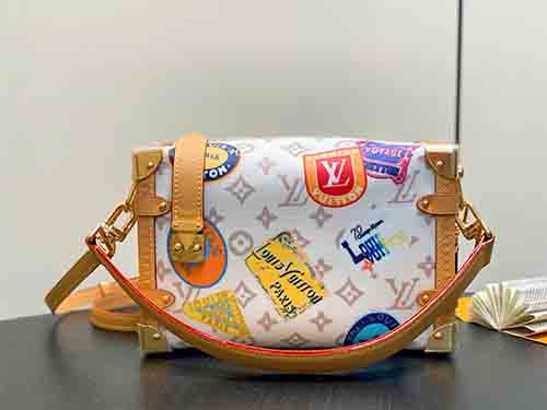 The Side Trunk MM bag from the Flight Mode collection revisits Louis Vuitton’s iconic trunk-making heritage with a refined vintage spirit. Crafted from Monogram Dune canvas, the piece evokes a softly aged aesthetic while maintaining a modern, lightweight structure. Playful patch-style labels, a luminous airplane charm, and the signature key bell enrich the design with travel-inspired character. Cowhide leather trim and metallic hardware further echo the House’s historic savoir-faire,