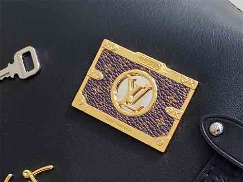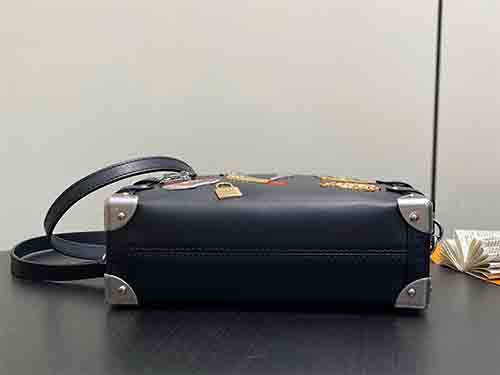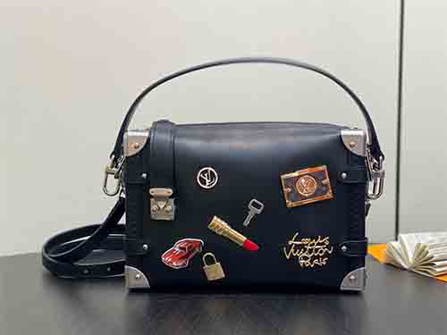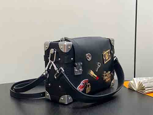 Revisiting the Spring–Summer 2015 runway, Artistic Director Nicolas Ghesquière reinterprets the iconic Side Trunk MM with bold individuality. Crafted from smooth cowhide leather, the bag is adorned with playful LV Stickers-inspired metal embellishments that celebrate creativity and contemporary spirit. Contrasting metallic tones highlight refined craftsmanship, while the structured trunk silhouette pays tribute to Louis Vuitton’s travel heritage. Designed for versatile wear
