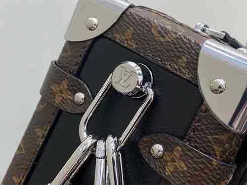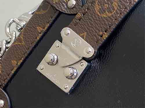 The Side Trunk Vibe JH bag reimagines Louis Vuitton’s iconic Side Trunk silhouette with a bold, contemporary attitude. Inspired by the House’s historic travel trunks, this design blends heritage craftsmanship with a rebellious, rock-inspired edge. Crafted from smooth, glossy Vibe calf leather, it features leather-wrapped studded framing, a signature metal S-lock closure, and refined metallic accents. Multiple detachable elements—including a chain, leather top handle,