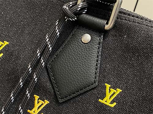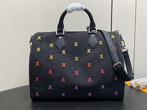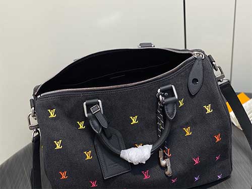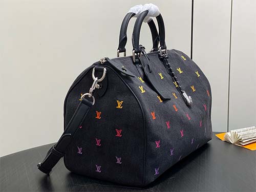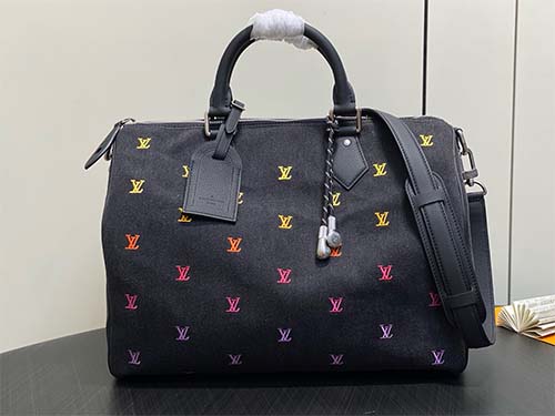 Louis Vuitton Speedy 40 Bandoulière Travel Bag LV Blason Denim Embroidered Logo with Headphone Charm Black Washed Denim – Pharrell Williams Collection M14136