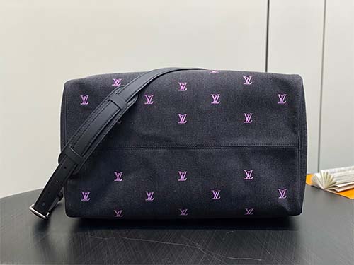 The Speedy 40 Bandoulière Travel Bag reinterprets a House icon through the creative lens of Pharrell Williams. Crafted in LV Blason Denim, this piece transforms musical rhythm into a refined fashion statement. A black washed denim base is elevated with continuously shifting, multicolored embroidered LV initials, creating visual movement and contemporary depth.