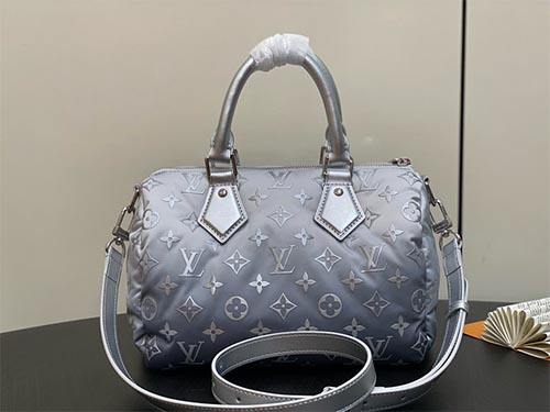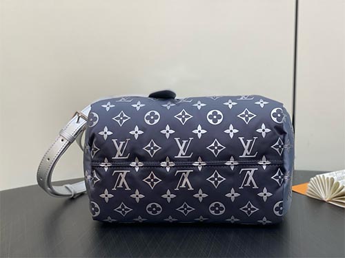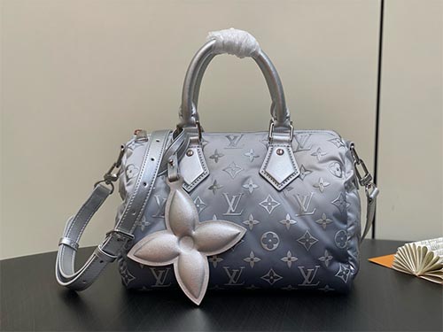 The Speedy Bandoulière 25 from the LV Snow Collection reimagines an iconic silhouette through a contemporary winter lens. Crafted from innovative Monogram nylon with a soft puffer texture, the bag features a refined silver gradient that creates a striking visual depth. Polished metal hardware and a sculptural floral charm elevate the design with signature Louis Vuitton elegance. Compact yet functional,