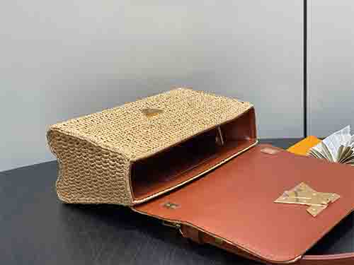 • Woven raffia body with contrasting leather trim