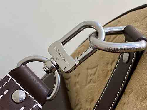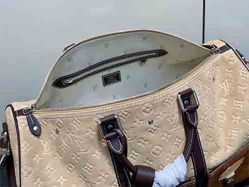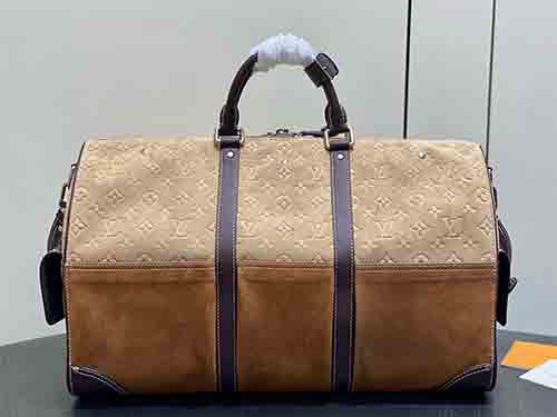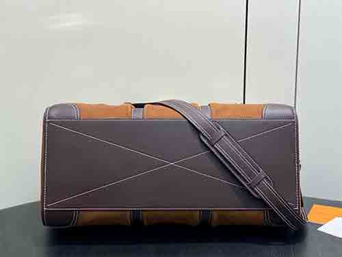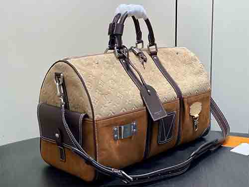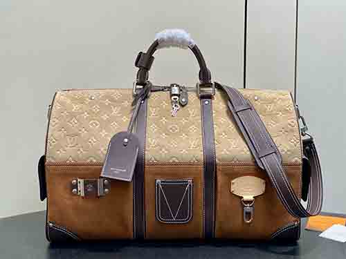 Inspired by Japanese workwear culture, this Keepall Bandoulière 50 travel bag is reimagined by Pharrell Williams and Nigo with a bold, industrial aesthetic. Crafted from Monogram suede leather, it blends heritage craftsmanship with modern functionality. Functional climbing-style hooks and refined metal plaques enhance its utilitarian spirit, making it a statement piece for contemporary travel.