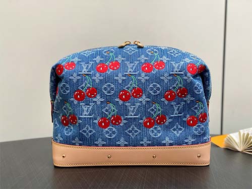 This large cosmetic pouch from the Louis Vuitton x Takashi Murakami collection reimagines the iconic Monogram Denim canvas with playful cherry embroidery. Crafted in blue denim with refined leather trim, decorative studs and glossy metal hardware, it reflects Murakami’s joyful pop-art aesthetic. A statement accessory that blends fashion, art, and function for daily luxury travel and organization.
